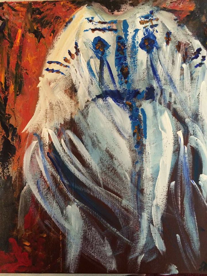 A couple of years ago I took this photo at a powwow in the Dallas / Fort Worth area, which in turn inspired this painting by Galina Krasskova that she sold at an artist in residency program. I was there trying to play around with photographing movement, while also celebrating another culture. I tried to capture the expression of movement, and also the artisanal craftsmanship that went into the outfit from the meticulous beading.