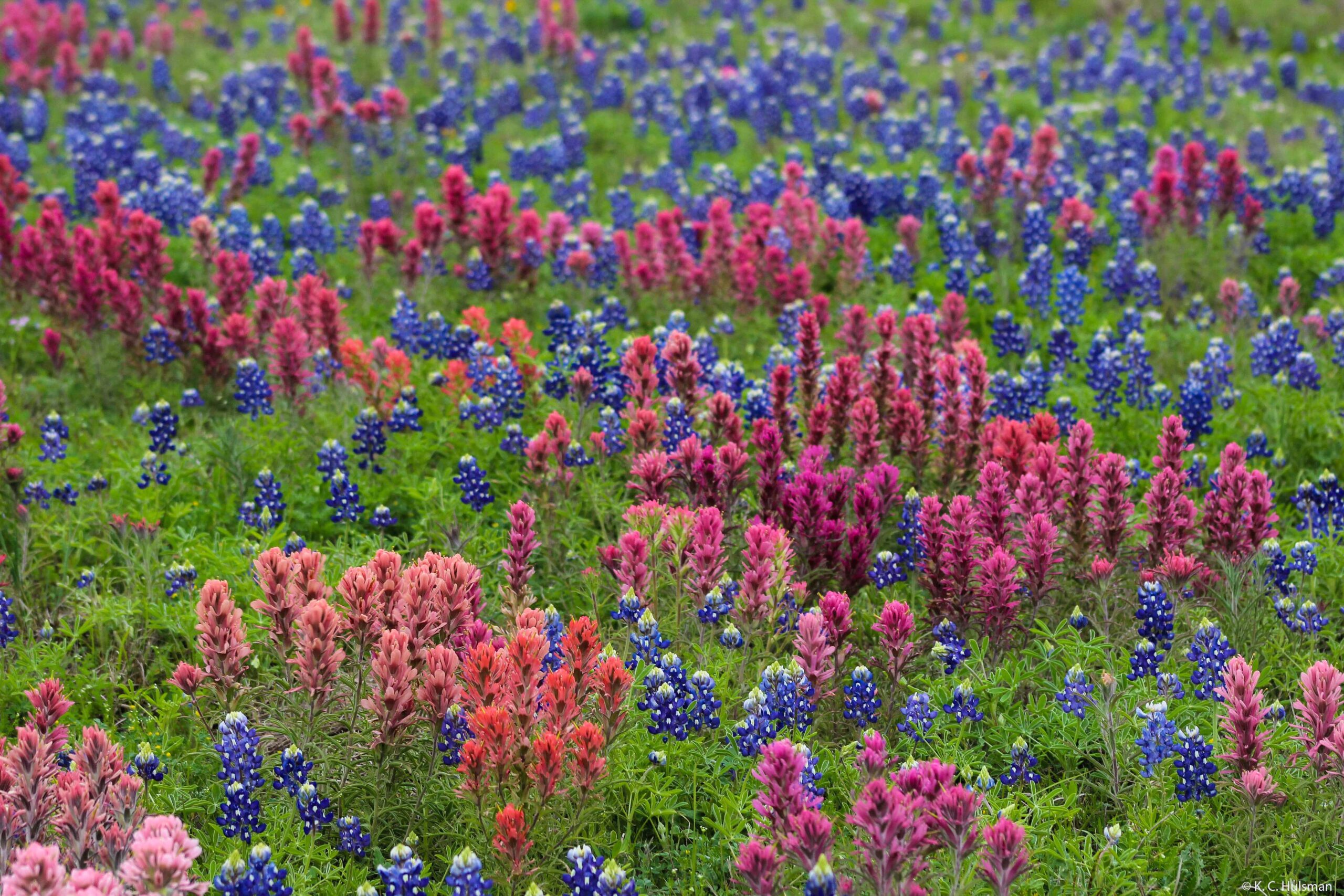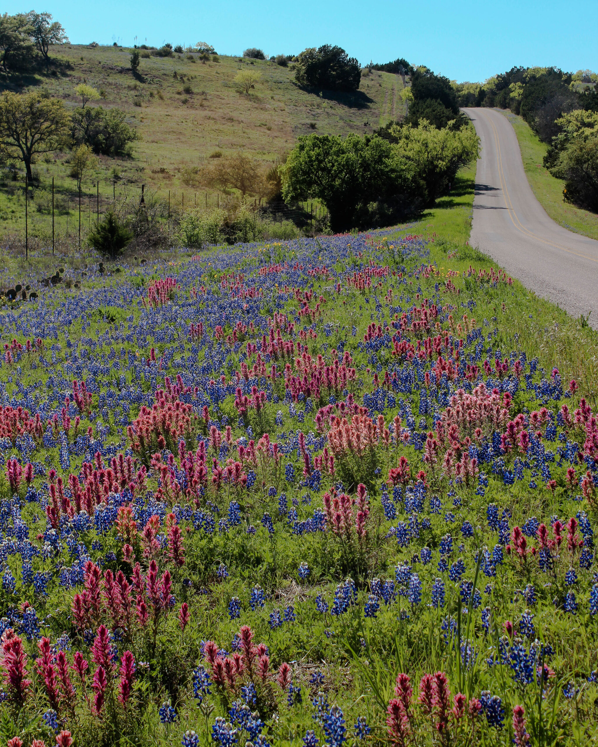 I was on the 501 between Pontotoc and Cherokee in the Texas Hill Country, when I stumbled along some roadside blooms that had a range of the prairie paintbrush blooming against the Texas state wildflower: the Bluebonnet.