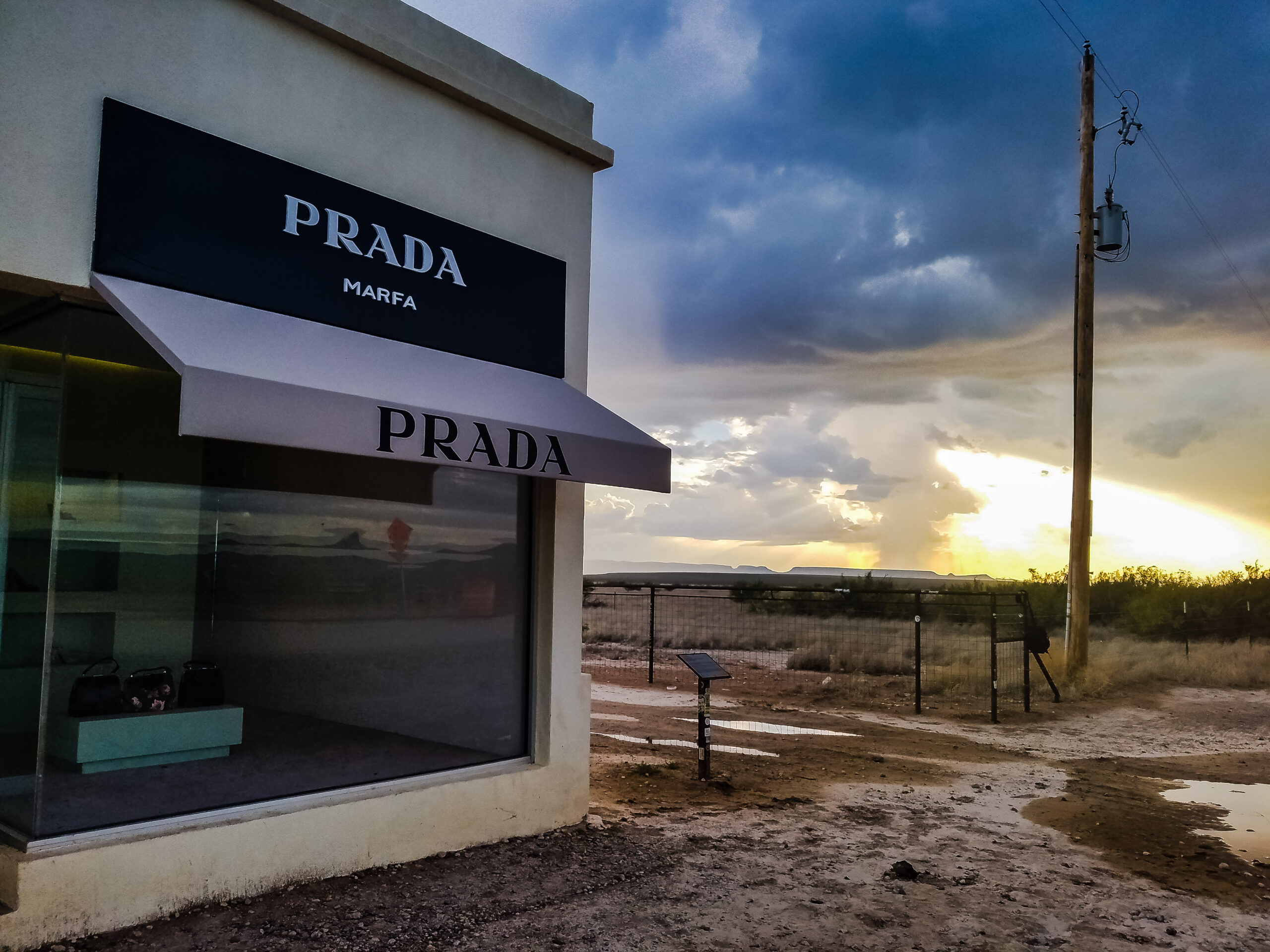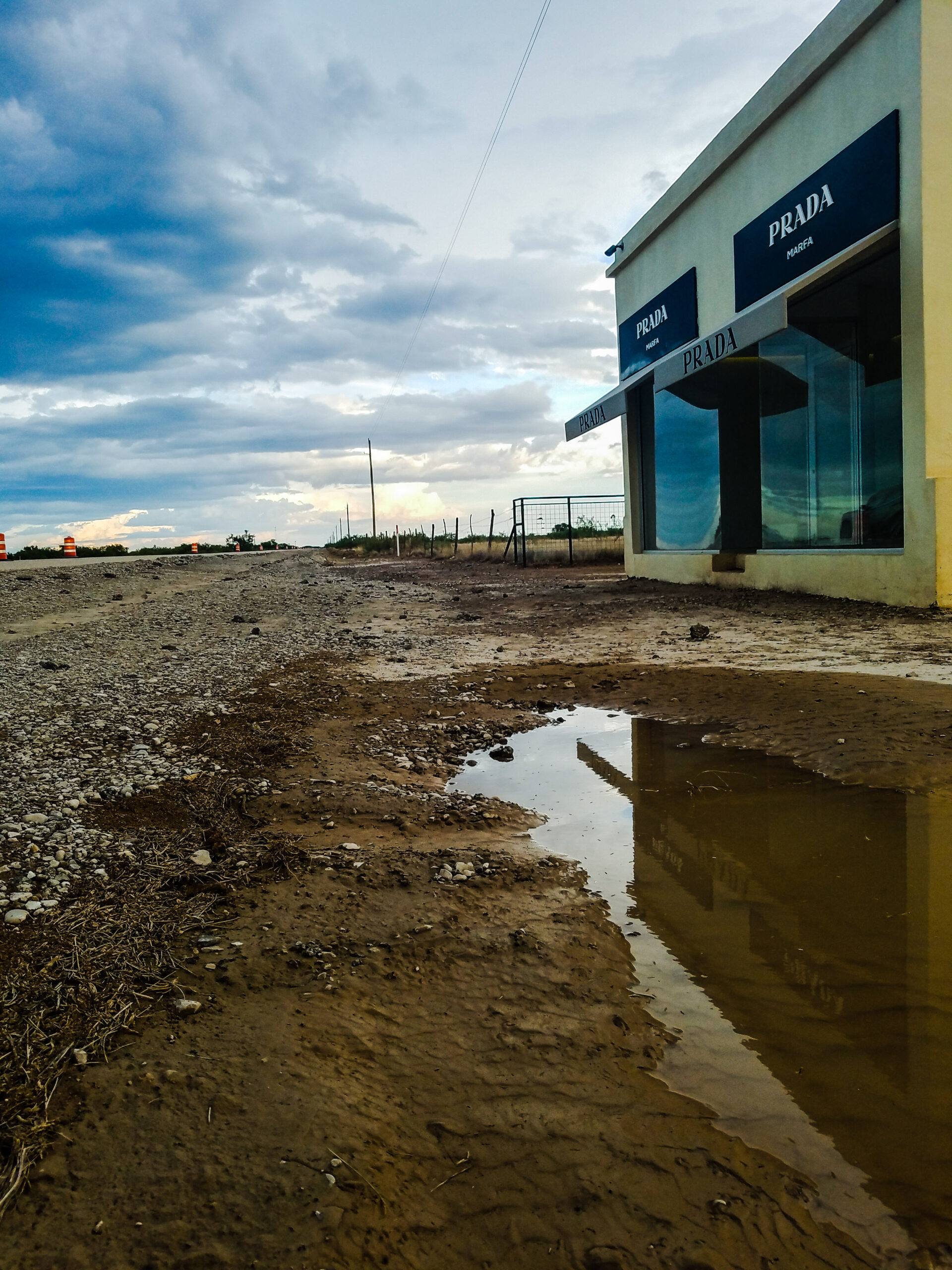 This is best embodied by the “White Shirt Marfa” just as it’s name suggests, it sells nothing but White Shirts, because apparently you can’t own enough of them. It can also be represented in Elmgreen and Dragset’s Prada Marfa, a pop culture land art installation, of a faux Prada store, with a door that isn’t functional. It’s been theorized to be the single most instagrammed location in the entire state. Of course, I couldn’t resist a Selfie either. It had just rained when I showed up, so I decided to take advantage of the mud and puddles, and stormy skies.